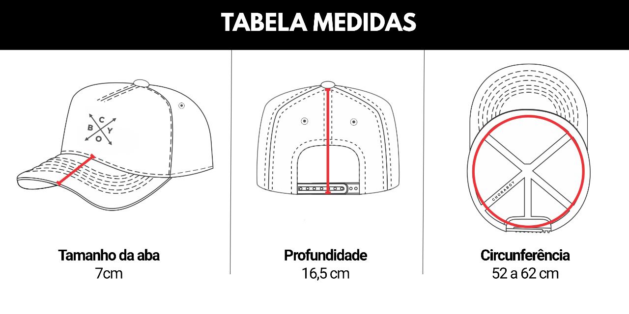 Profundidade: 16,5 cm (medir por fora acompanhando a costura do boné até a base);