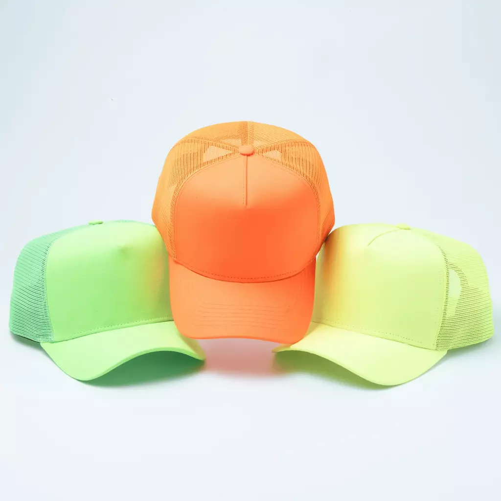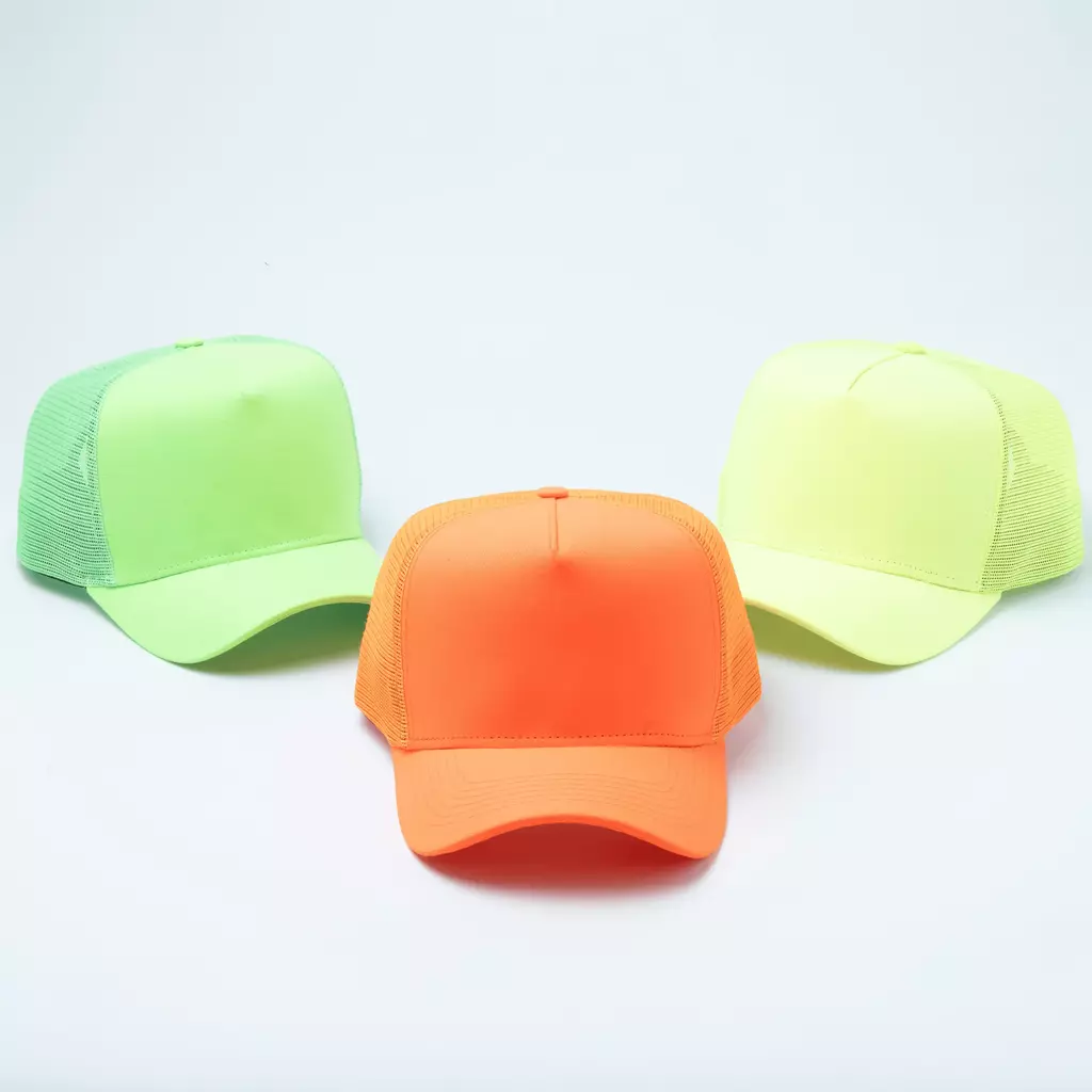 • 3 Bonés modelo Aba Curva Trucker - Verde Neon, Laranja Neon e Amarelo Neon;