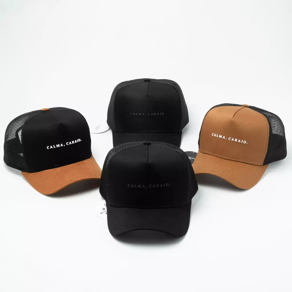 • 3 Bonés modelo Aba Curva Trucker - CALMA, CARAIO e 1 Boné Acrilico sem tela CALMA, CARAIO;